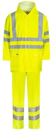 Ett högpresterande regnställ i varsel i PU kvalitet. Regnstället är vind & vattentätt. Vattentäthet 11.000MM. Fast huva med snörning som kan döljas i kragen. Dragkedja dold med tryckknappar. Tryckknappsjustering i ärm- och benslut. Två utvändiga fickor på regnjackan och två ficköppningar på byxan. Resårlinning på byxan.